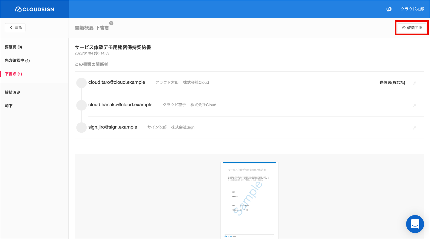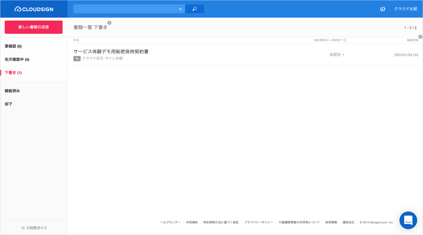 Deleting a draft Documents that you have saved as drafts can be deleted if they are no longer needed. Operation method 1. Click “Draft” from the side bar on the left. 2. Select the documents you want to delete. 3. Click “Delete” at the top right.