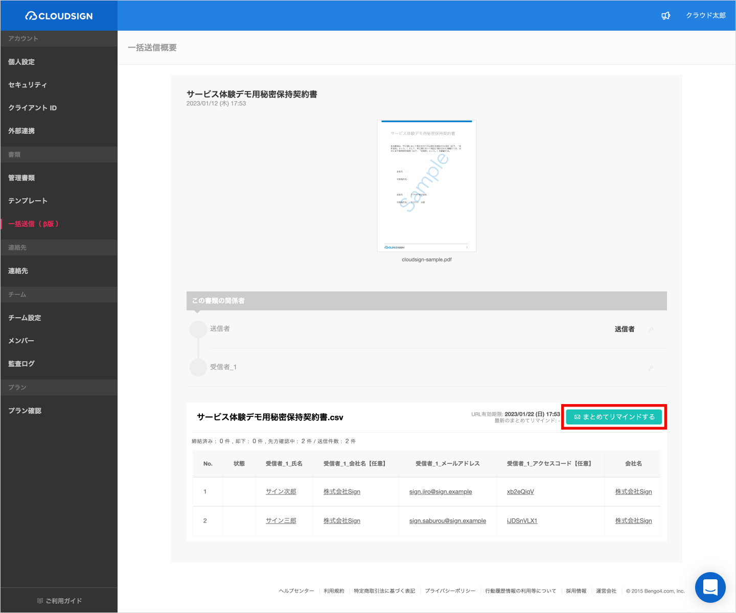 The bulk sending function uses CSV files to enter the recipients and input fields of documents. For example, if you are able to export CSV files from software applications used at your company, you can copy and paste this data into the CSV file used by CloudSign without having to enter “text fields” each time you create a document. Please consider using Web API for using CloudSign even more seamlessly.